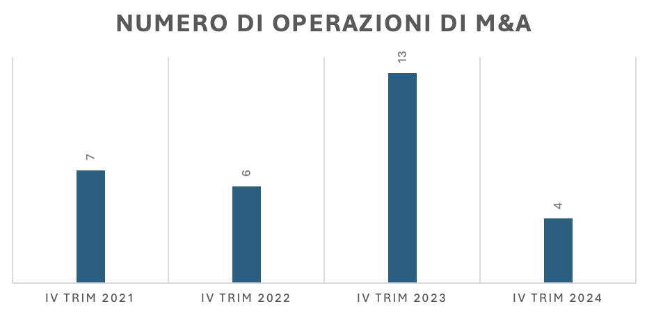 Il quarto trimestre del 2024 ha fatto registrare 4 nuove operazioni di M&A tra società operanti nel settore della Logistica e dei Trasporti in Italia, mostrando un andamento in decrescita sia rispetto al quarto trimestre 2023, sia rispetto ai medesimi trimestri degli anni 2021 e 2022.