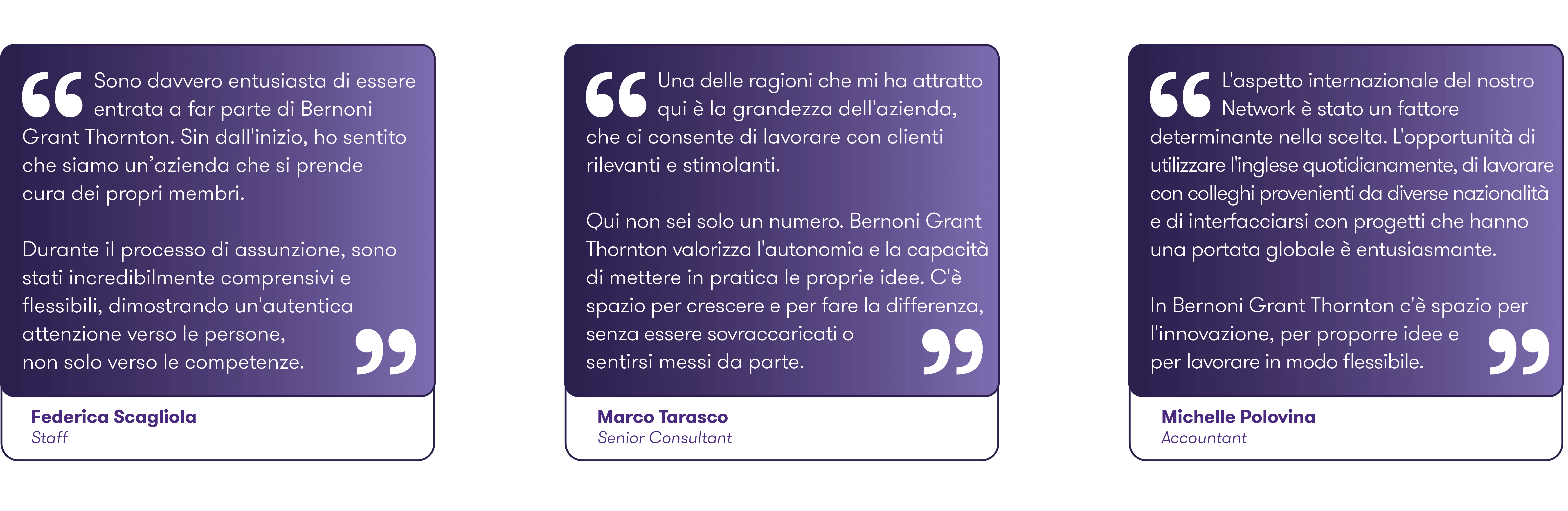 Bernoni Grant Thornton unisce l’attenzione al dettaglio di uno studio professionale con le opportunità di crescita di un network internazionale presente in oltre 140 paesi. Offriamo servizi di consulenza alle imprese nelle aree Tax, Advisory, Outsourcing, HR & Payroll, Digital. Grazie alle opportunità di periodi di secondment all’estero presso le sedi di Grant Thornton nel mondo, avrai la possibilità di accrescere il tuo sviluppo professionale.