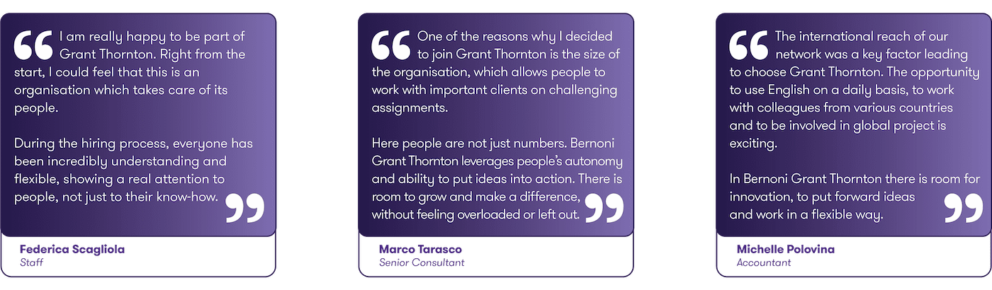 Bernoni Grant Thornton combines the attention to detail of a professional firm with the growth opportunities of an international network with a presence in over 140 countries globally. We offer Tax, Advisory, Outsourcing, HR & Payroll and Digital business consultancy services.  Thanks to the secondment opportunities at Grant Thornton offices abroad, you will have the possibility to boost your professional development.