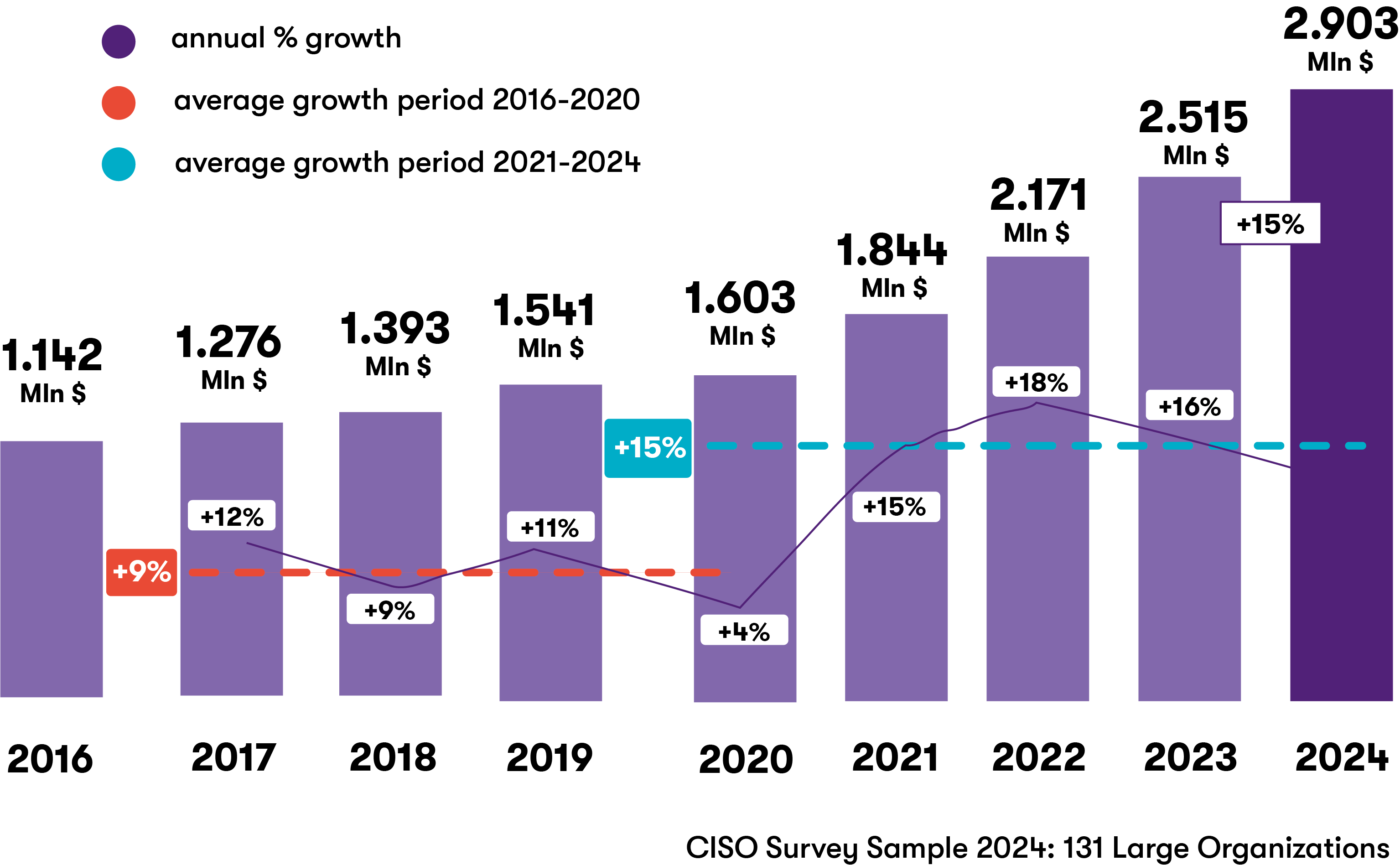 From a market point of view, the cybersecurity sector is experiencing an unprecedented expansion. The global market was estimated at $245.62 billion in 2024 and is expected to reach $500.70 billion by 2030, with a compound annual growth rate (CAGR) of 12.9%[2]. The trend is very positive in Italy, too: in 2024, the national market reached 2.48 billion euros, recording a 15% increase % compared to 2023. Among the most dynamic sectors are logistics, transport and services, which, favored by the implementation of the NIS2 Directive, recorded above-average increases by 25% and 24%, respectively[3].