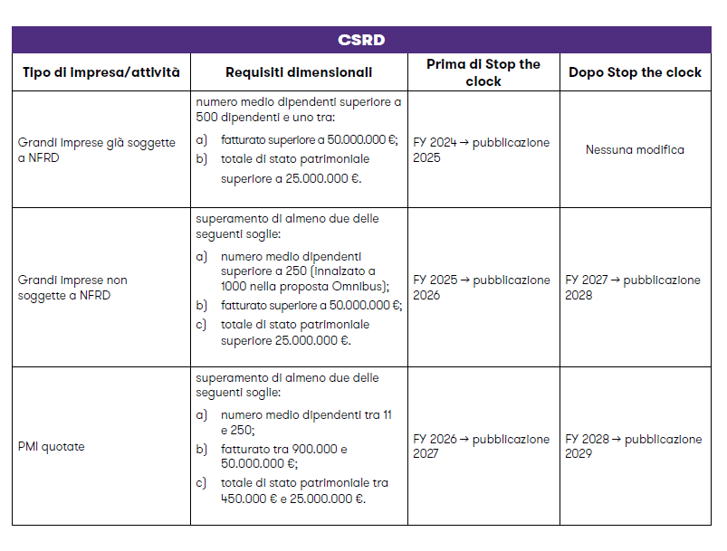 Di seguito una tabella esemplificativa dell’impatto della Direttiva “Stop the clock” sulla normativa introdotta dalla CSRD relativamente al reporting ESG.