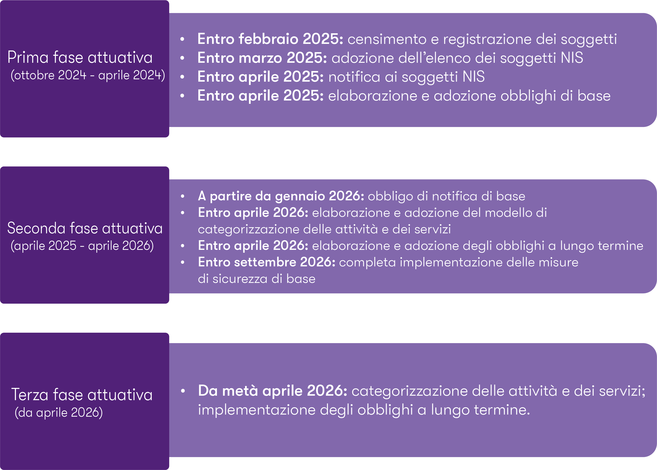 Per quanto riguarda l’Italia, la NIS2 è stata recepita con il Decreto Legislativo 138/2024. Il decreto attribuisce all’Agenzia per la Cybersicurezza Nazionale (ACN) un ruolo centrale nella supervisione e nel coordinamento, definisce le modalità di identificazione dei soggetti obbligati e stabilisce la piattaforma digitale di riferimento per la gestione delle comunicazioni e delle notifiche. Le principali scadenze operative per i soggetti italiani sono: