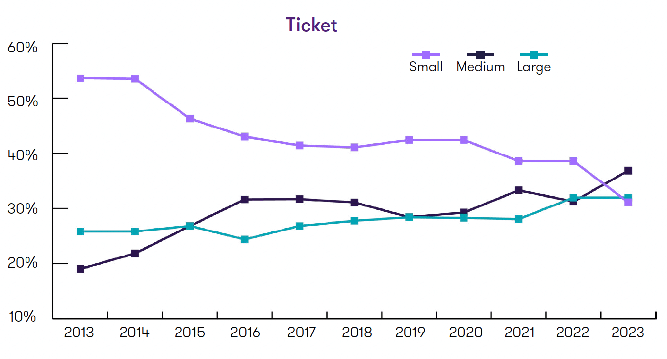 Aumentare la dimensione dell’investimento porta a benefici legati alle economie di scala e, soprattutto, riduce la rischiosità intrinseca dell’azienda e dell’operazione. Alla luce di quanto appena detto, il segmento MID rappresenta il ticket che si è più diffuso proprio per mitigare il rischio e trarre vantaggio dalle suddette economie di scala.