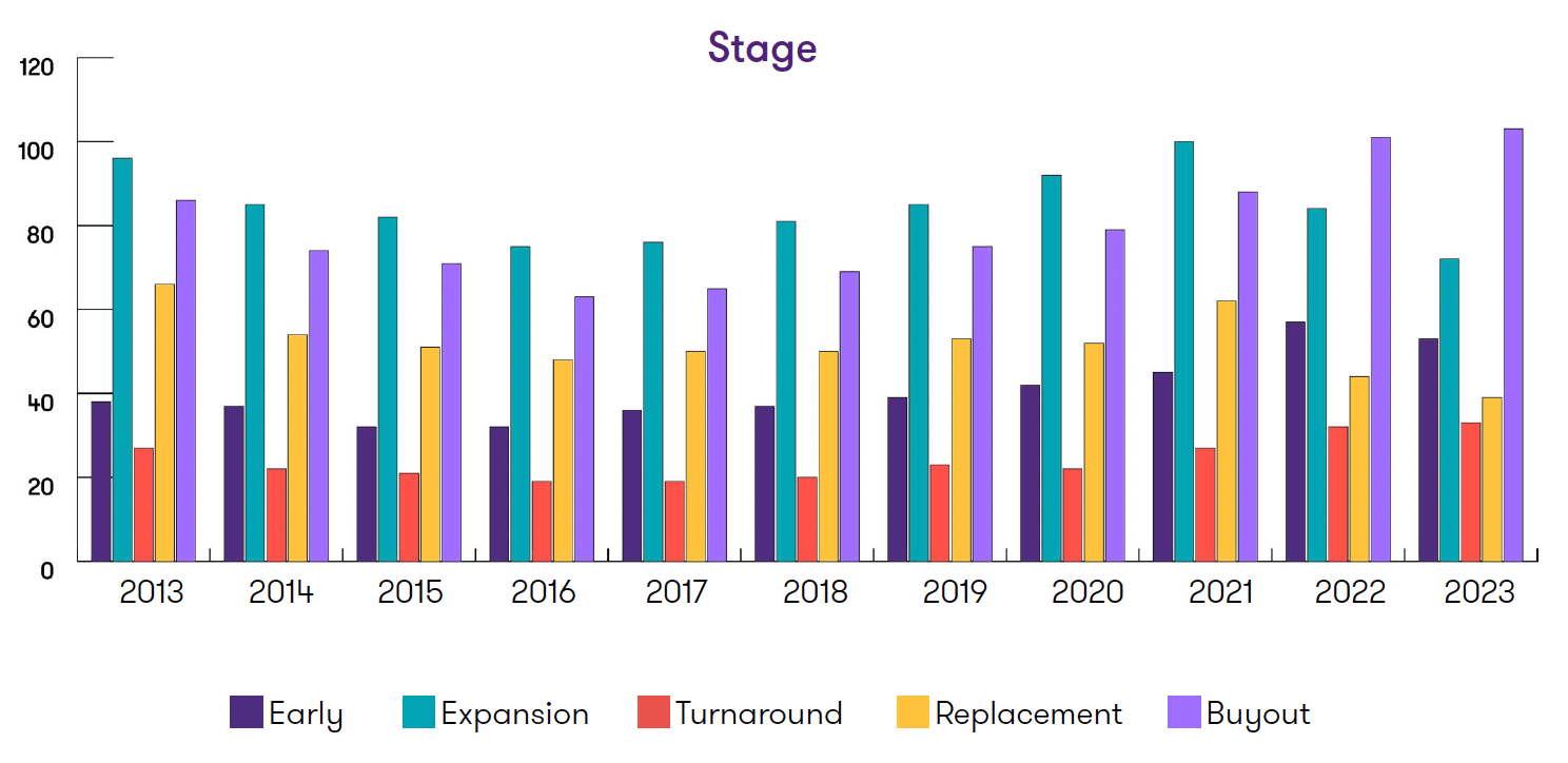 Si è potuto constatare che fino al 2021 gli investimenti erano maggiormente incentrate sull’Expansion e il Buy out. Negli ultimi anni però molti operatori hanno deciso di dedicarsi quasi esclusivamente in attività di investimento di tipo Buyout.